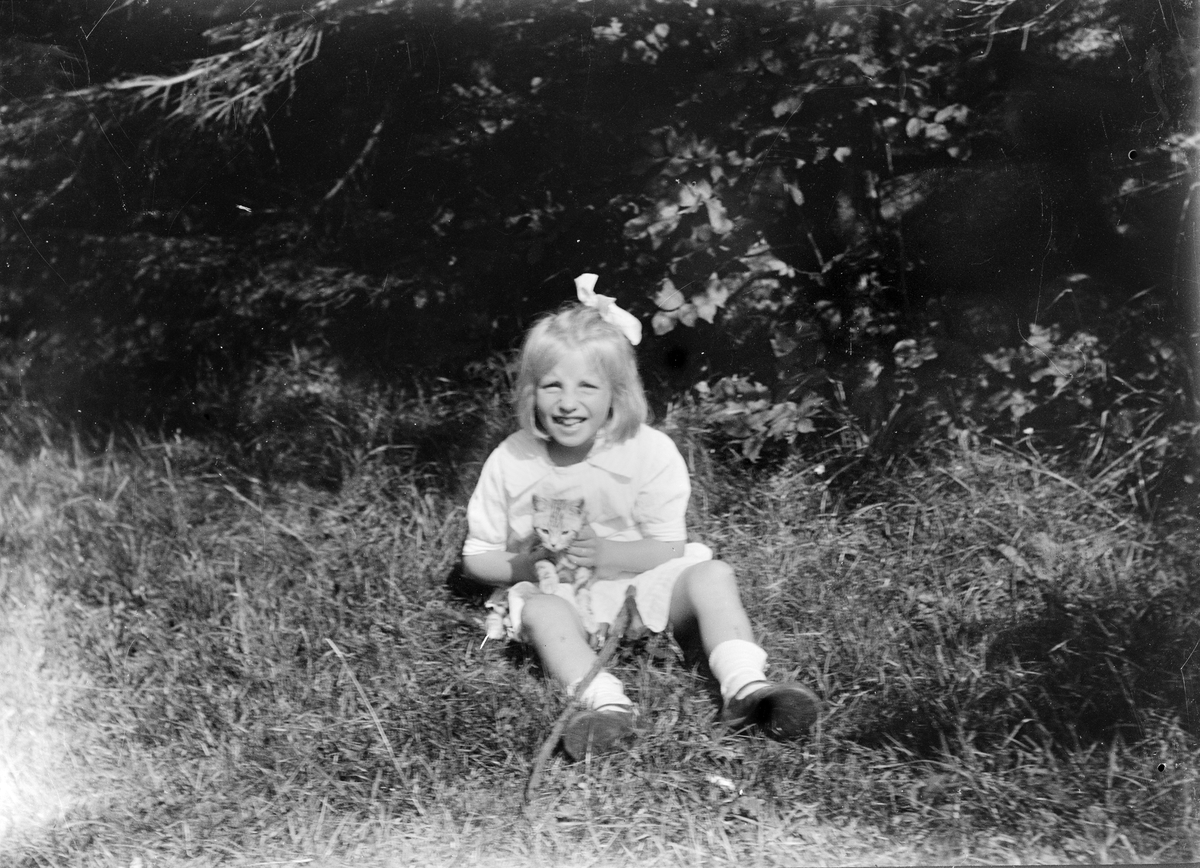 Ruben och Christiane Liljefors dotter Marit sitter med kattunge ute på gräsmattan i trädgård, sannolikt i Sverige