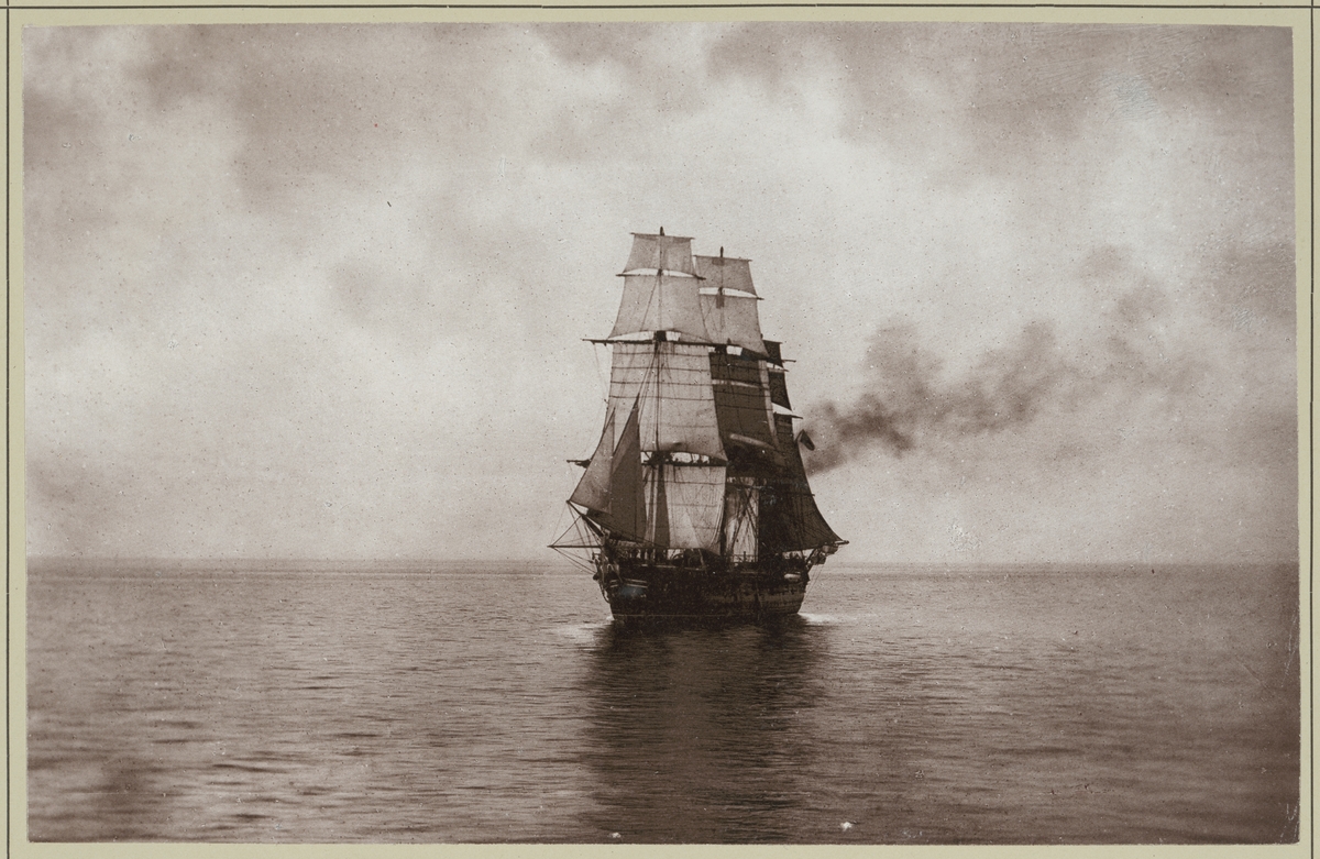 Bilden visar den tyska korvetten Stosch till havs, framdriven med segel och ångmaskin.