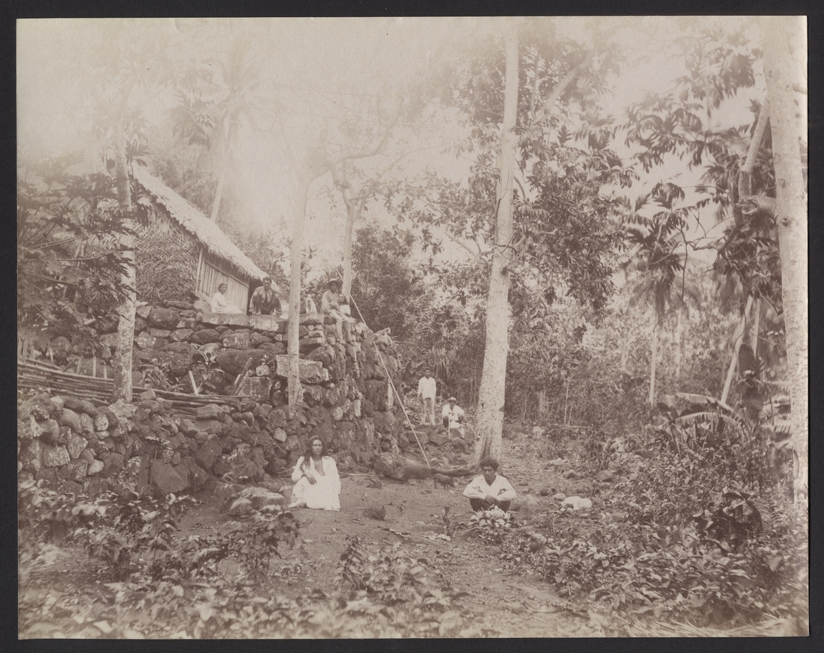 Bilden visar invånare på Nuku Hiva som har samlats runt en hydda som står på en stenterrass i skogen.