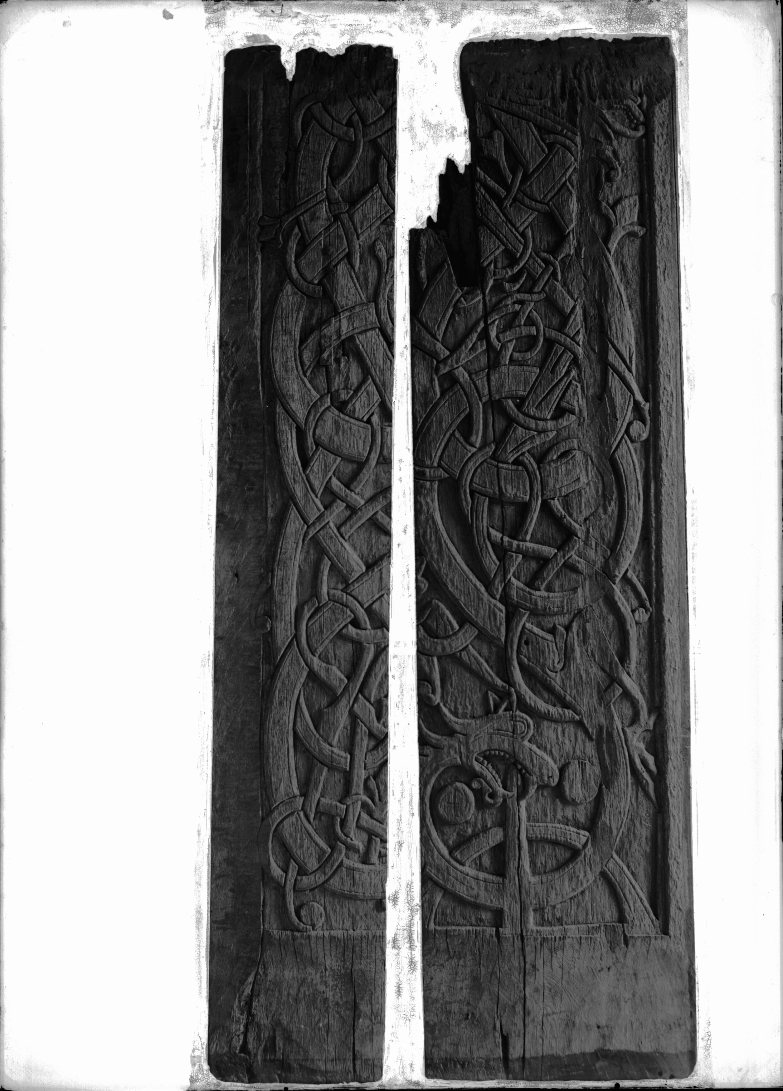 Ekplankor från gamla träkyrkan med rik dekor i plattrelief. På den högra ses Sigurd Fafnesbanes svärd nedifrån tränga in i drakens gom. 1000-talets mitt.