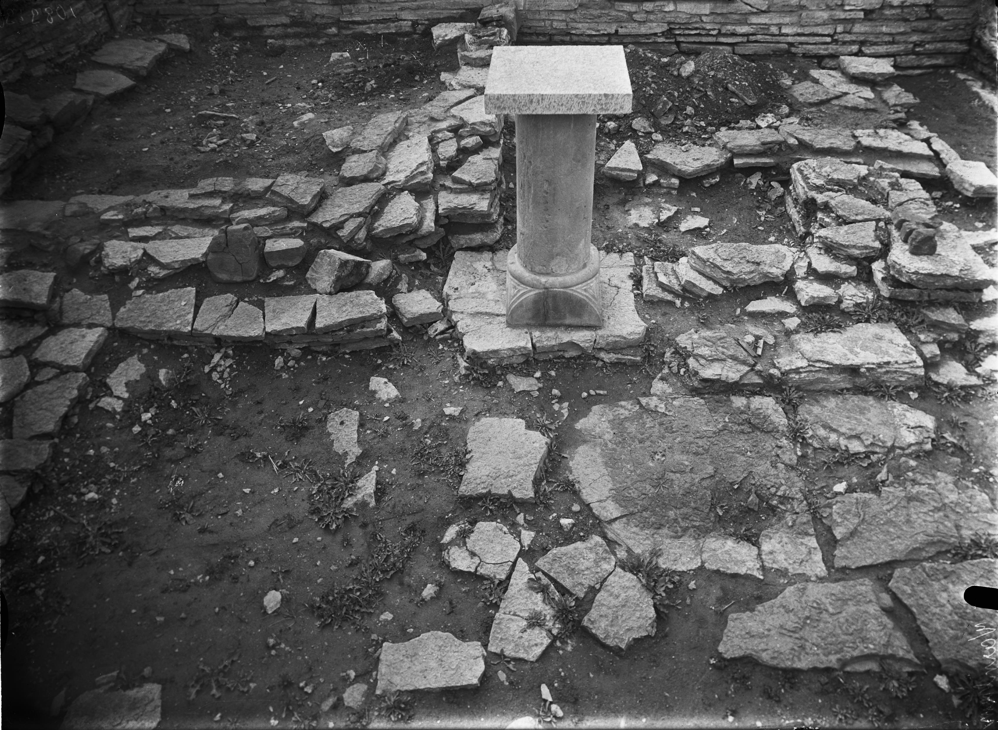 Västra längans långa kolonnrum. Det inmurade sydöstra hörnet innanför pelaren nummer fyra har sannolikt varit en stor eldhärd. Från norr.