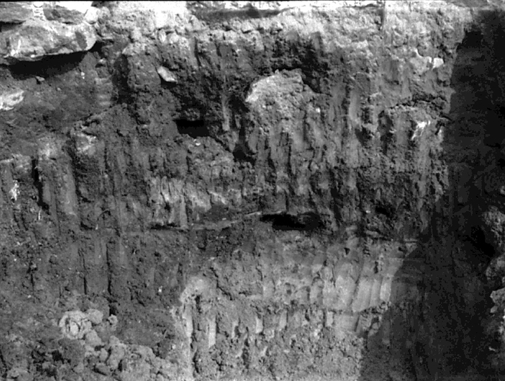 Grundgrävning för tillbyggnad. Detalj av norra schaktväggen.