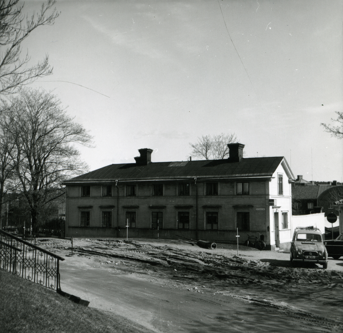 Olof Bromans gata, kvarteret Kyrkbacken 1, Hudiksvall, med Märta Larssons Bageri före rivningen. På bilden syns en lång huslänga med många fönster. Gatan i förgrunden är under omläggning. Till höger står en bil parkerad. Till vänster trappräcket vid trappen upp mot kyrkan.