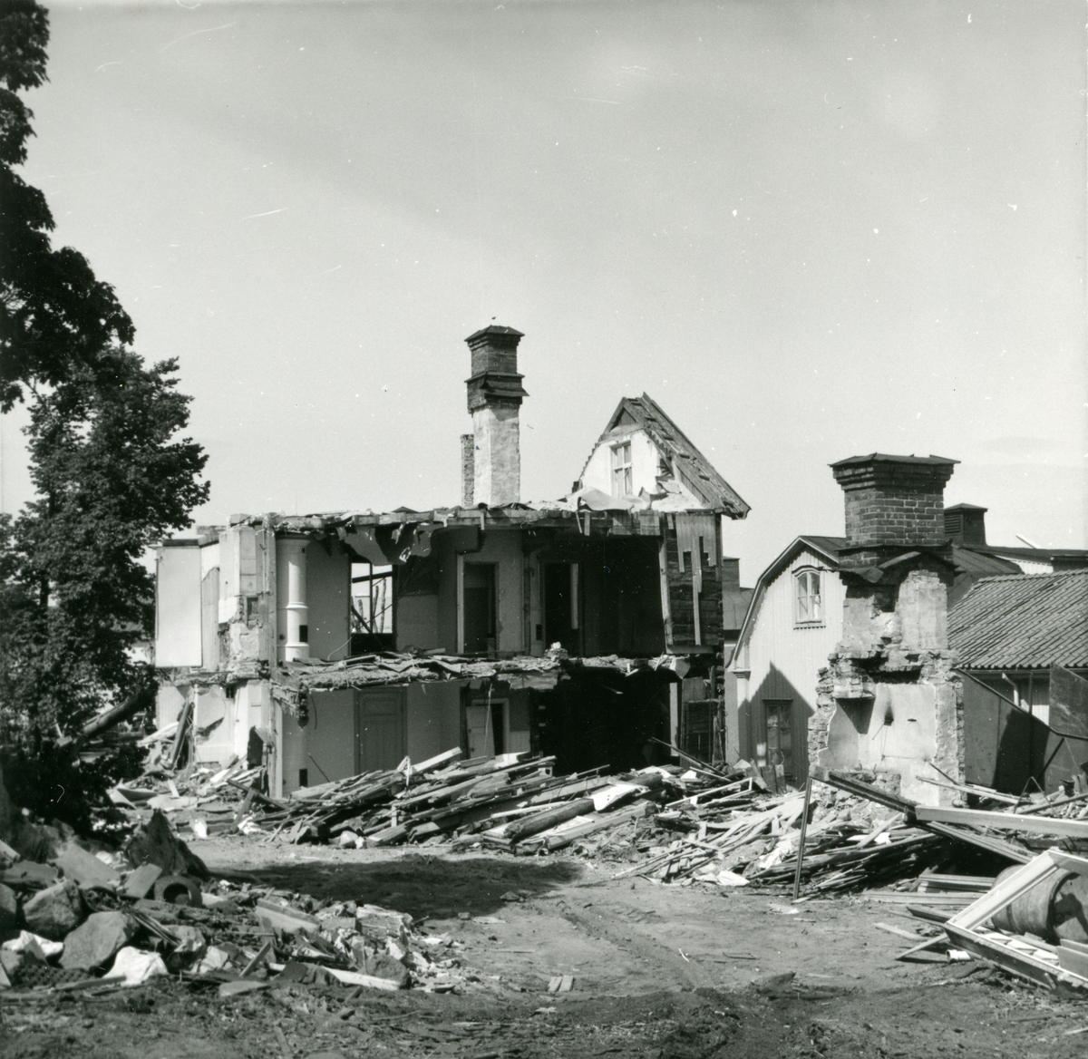 Skräddare Edqvists gård, sett inifrån gården, under rivning. Kvarteret Kyrkbacken 2, Hudiksvall.