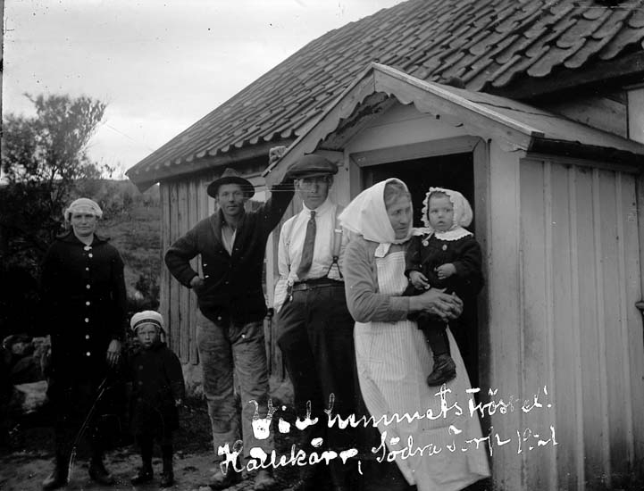 Skrivet på bilden: "Vid hemmets tröskel! Hällekärr, södra Torp. 1921."
