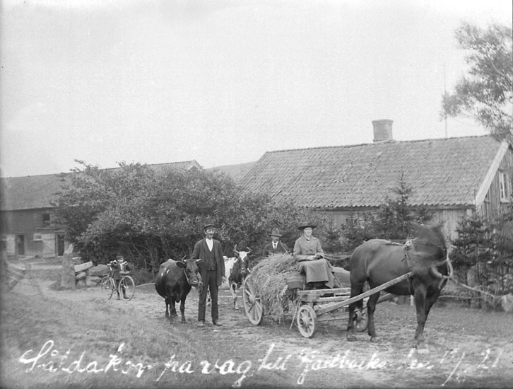 Enligt noteringar: "Sålda kor på väg till Fjällbacka. Vid cykeln Gösta, vid kon Johan, Elisabet Krok. 12/8 1921."