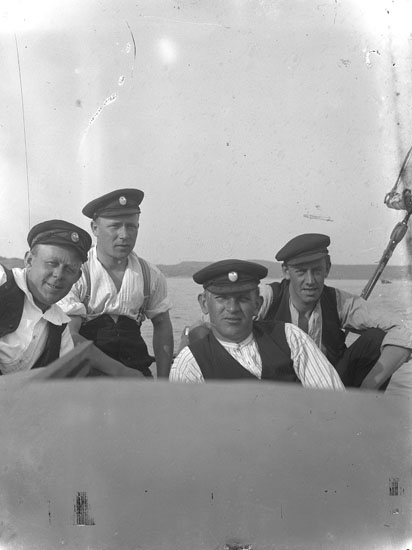 Enl. text i blå bok: "Fyra män i sittbrunnen på en segelbåt."