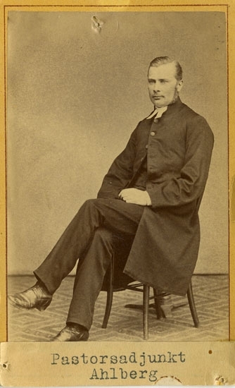 Text på kortets baksida: "August Ahlberg f. 1838. Pastoradj. i U-a 1871. Pastor i Abild 1875, pastor i Ljungby 1878".