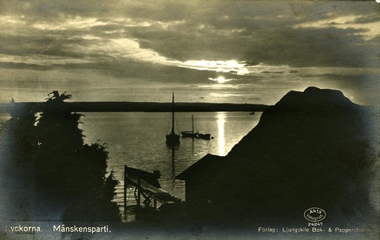 Enligt Bengt Lundins noteringar: "Lyckorna. Månskensparti. Brygga och båtar".