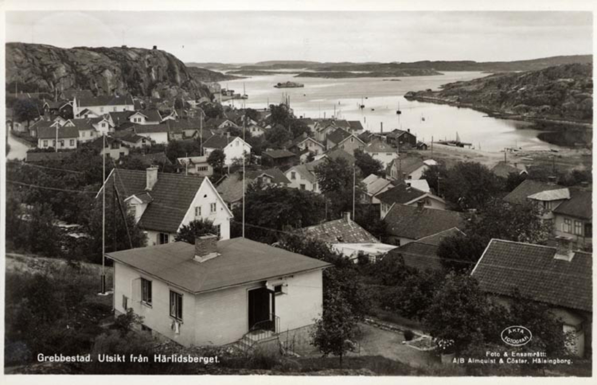 Tryckt på kortet: "Grebbestad. Utsikt från Härlidsberget."