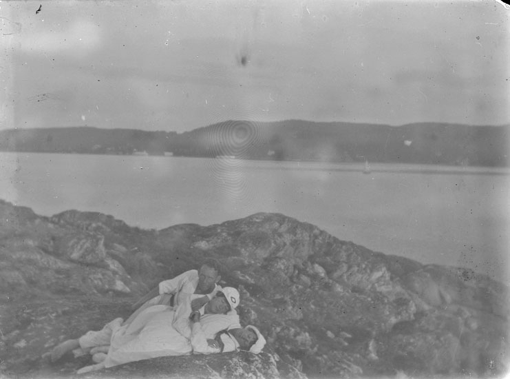 Enl. text i blå bok: "En man och två kvinnor liggande på berg i skärgården."