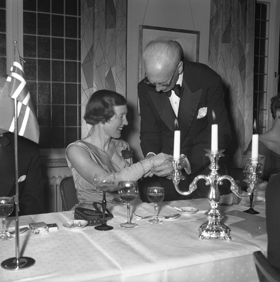 Sjösättningsmiddag för fartyg 166 M/T Acina. Fartygets gudmor får sitt smycke av varvets VD.