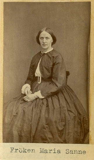 Text på kortets baksida: "Fröken Marie Auror Sanne, f. 1831 d. 1913. Begraven i Lysekil. Syster till J. N. Sanne".