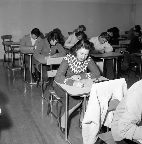Enligt notering: "Anita Zachrisson (Praktiska Realskolan) skrivning på nutidsorientering 1-1-1956. Foto Knut".