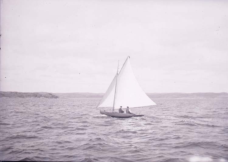 Enligt text som medföljde bilden: "Kappsegling". En segelbåt utanför Gustafsberg på Byfjorden.