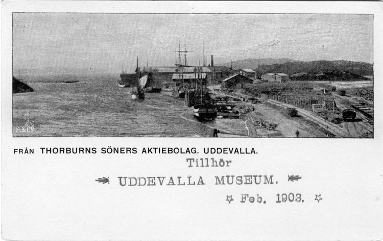 Tryckt text på vykortets framsida: "Från Thorburns söners aktiebolag, Uddevalla."