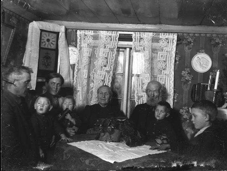 Enligt notering: "I finrummet; barn och vuxna, från vänster, Olle, Albertina, Britta, Aron. Från vänster barnen, Hans, Klas, Sven, Nils, Lilla Svälte".