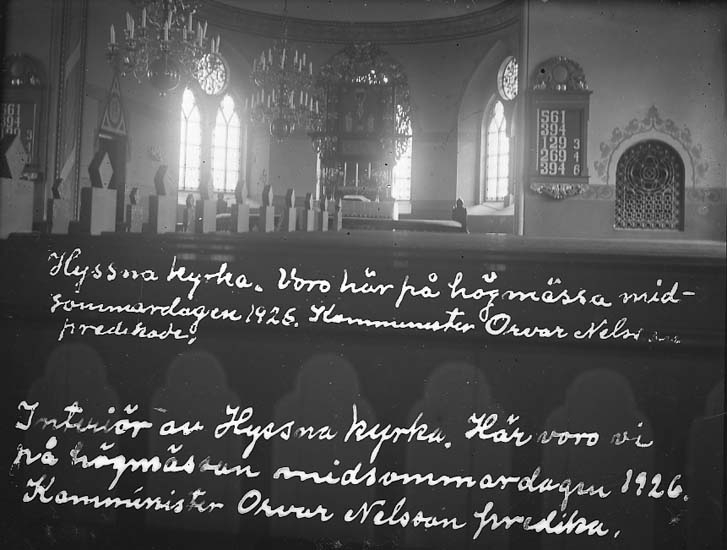 Enligt text på fotot: "Interiör av Hyssna kyrka. Här voro vi på högmässan midsommardagen 1926. Komminister Orvar Nilsson predika".