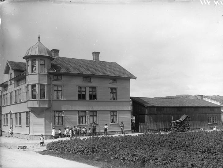 Enligt tidigare noteringar: "Flerfamiljshus på söder i Uddevalla. Framför huset många barn, i förgrunden potatisåker".