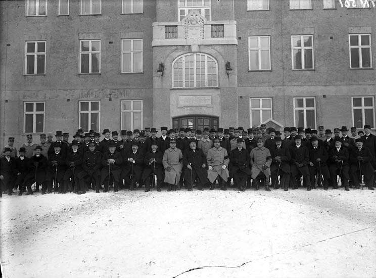 Enligt tidigare noteringar: "Gruppbild framför kanslihuset Bohusläns regemente på några offficerare och en mängdcivilla gäster vid invigningen söndagen 18 jan. 1914."