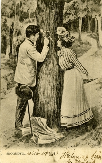 Postkort. "Skogsidyll." Par som ristar ett hjärta med pil genom i barken på ett träd