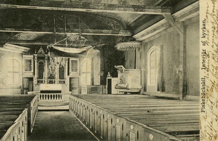 Notering på kortet: Interiör af Fiskebäckskils kyrka.