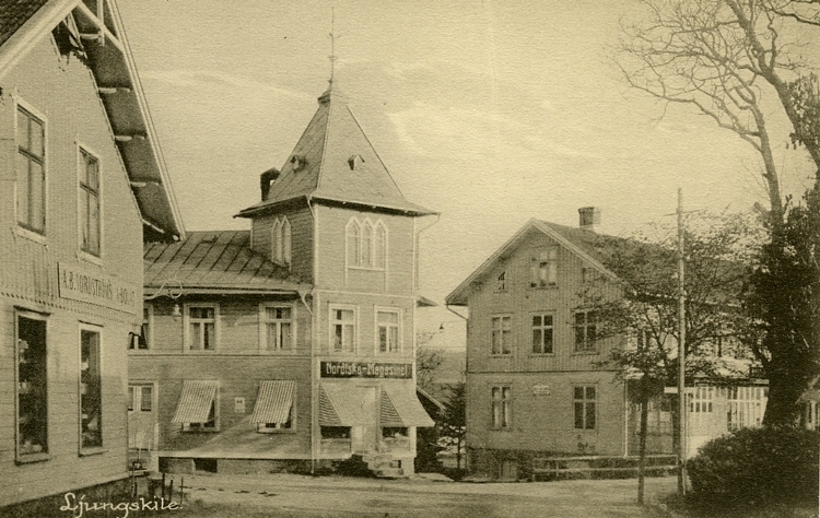Enligt Bengt Lundins noteringar: "Ljungskile. Nordströms hörna, tornhus och apotek".