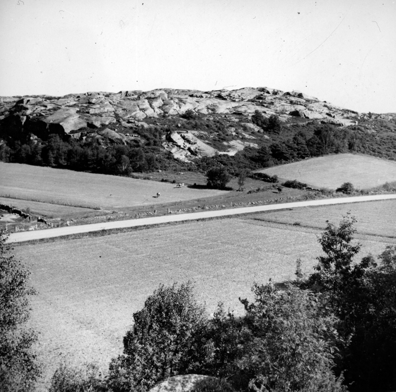 Enligt text: "Efter a 1698. Svenneby sn. Svenneby. Översikt. På bergsudden i bildens mitt ristningarna nr 2 o 3. T.v. härom skymd av träden nr 4 och t.h. n:r 5. Från V. 5/9 1945 Å.F".