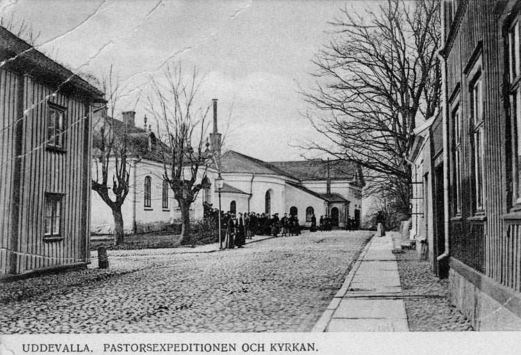 Tryckt text på bilden: "Uddevalla. Pastorsexpedition och kyrkan."
