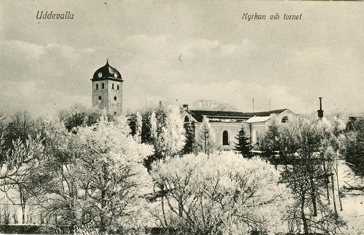 Tryckt text på bilden: "Uddevalla. Kyrkan och tornet."