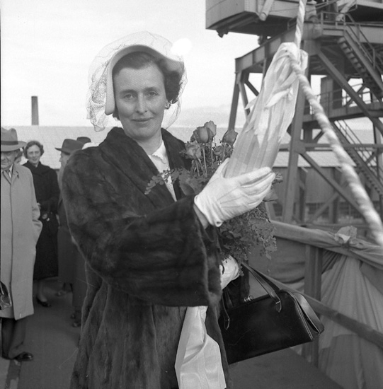 Dop och sjösättning av 122 M/T Glimmingehus. Kvinnan på bilden är fartygets gudmor.