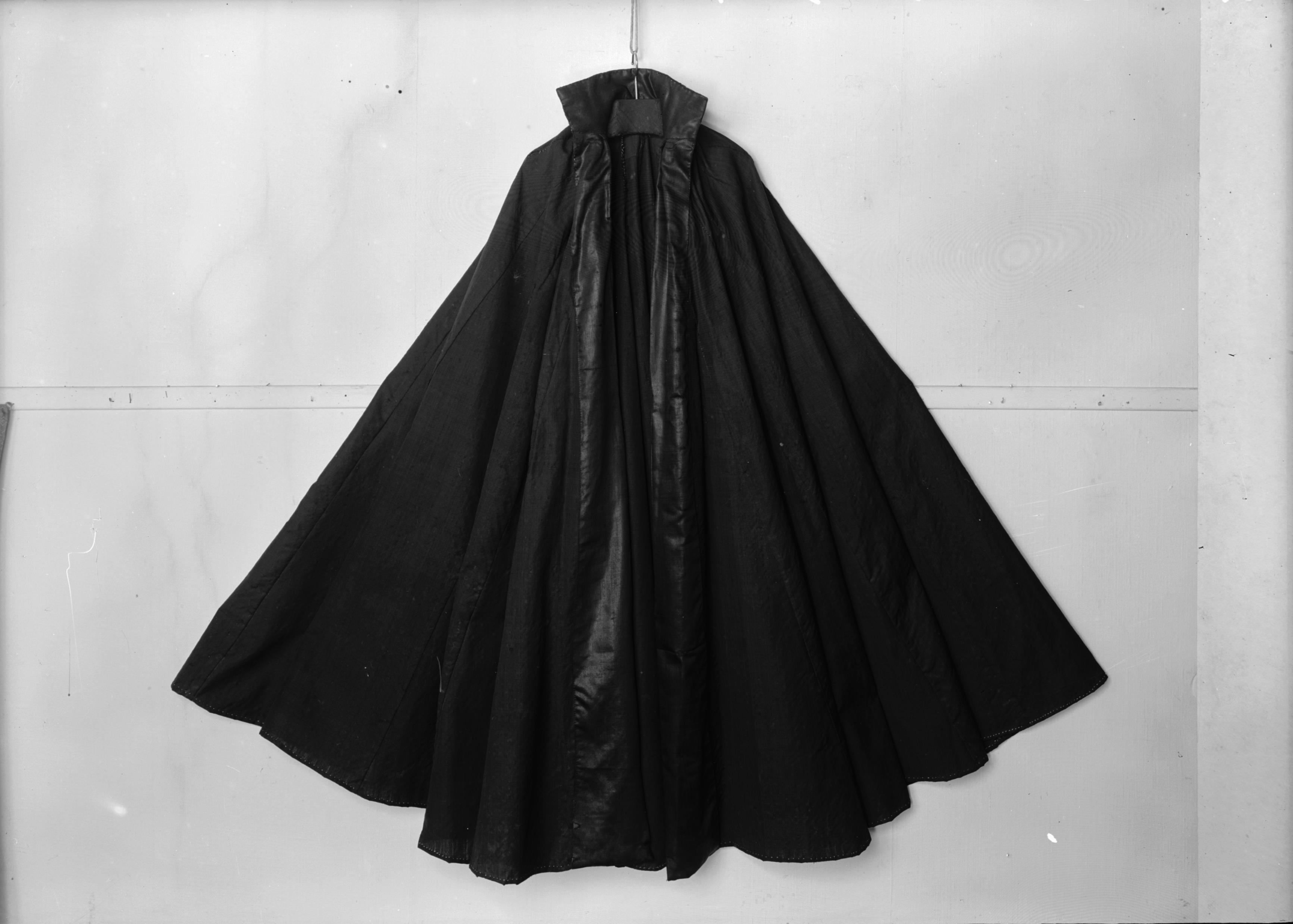 Prästkappa i svart ylle med 17 våder. Från 1600-1700-talet. Efter renoveringen.