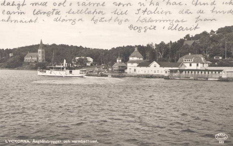 Tryckt text på kortet: "LYCKORNA. Ångbåtsbryggan och varmbadhuset.