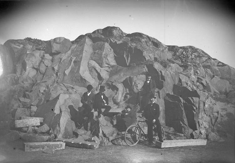 Enligt text som medföljde bilden: "Lysekil. Laf, Hjort, Kalle, Bås, Eric C. vid Carlavägen 1899".
