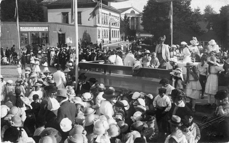 Vy över Kungstorget i Uddevalla, sannolikt är bilden tagen vid statyinvigningen.