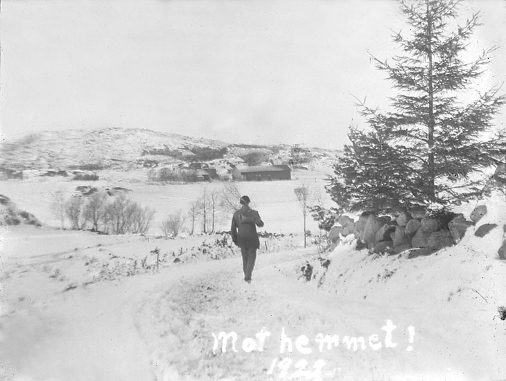 Enligt noteringar: "Mot hemmet ! 1922, Skistad Vestergård i vinterskrud".