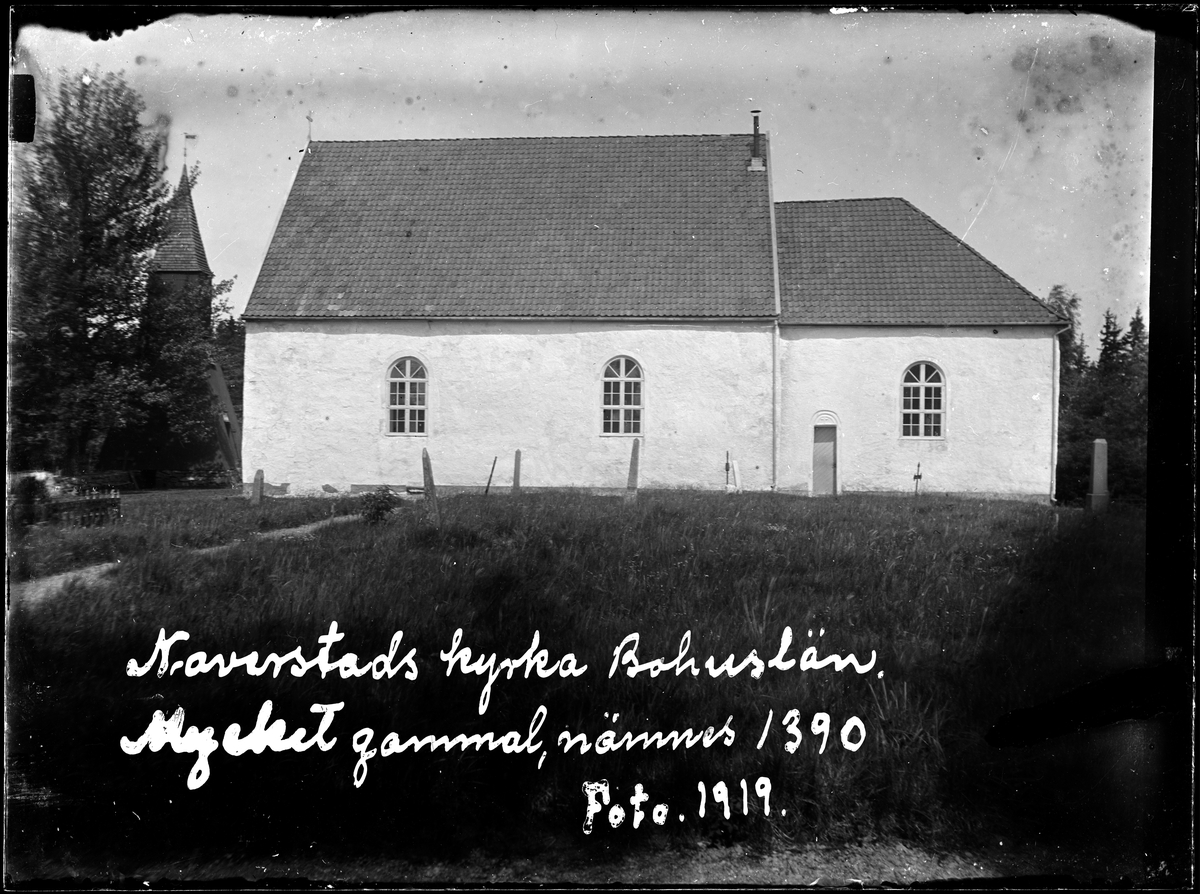 Enligt text på fotot: "Naverstads kyrka Bohuslän. Mycket gammal, nämns 1390 Foto. 1919".