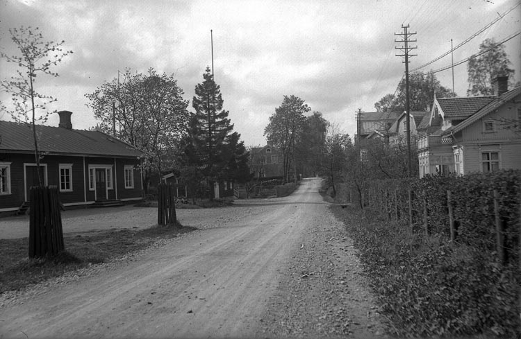 Enligt fotografens noteringar: "Lilla Torget vid Munkedals samhälle, fabriken i bakgrunden."