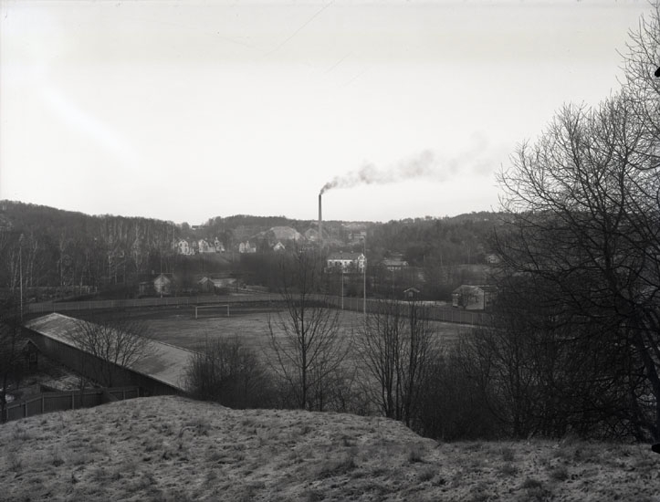 "Munkedals idrottsplats. Huset i centrum av bilden är Hedeholm, numera nedbrunnet."
