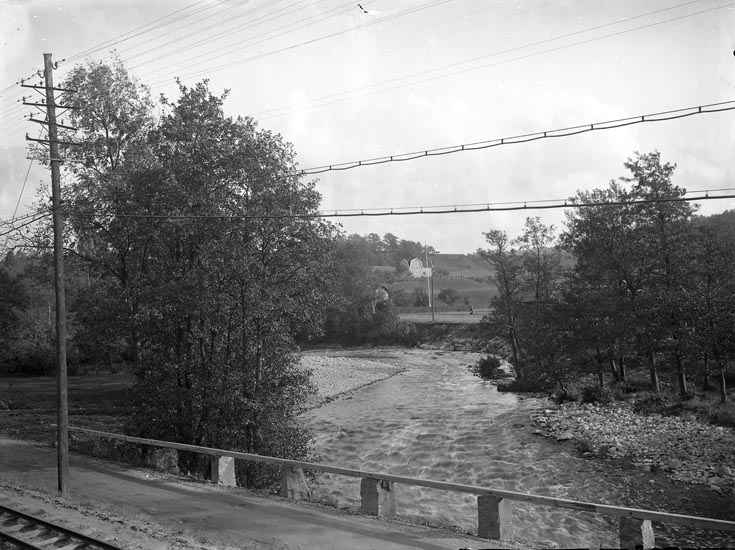 Text som medföljde bilden: "Älven vid Hedeholm. Bruksvägen Munkedals Järnvägen (lille järnvägen). Huset med brutet tak till h. Fritz "på Korpäs". Hansson, legendarisk portvakt på bruket."