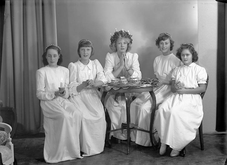 Enligt fotografens journal nr 7 1944-1950: "Luciorna, Anita Brant, Monika Lindqvist, Lena Olsson, Felltoff, Sylvia Johansson".