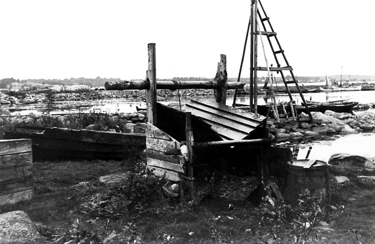Skrivet på baksidan: Blekinge, Listers hd, Mjällby sn, Hörvik. Där bottengarnen tjäras, samt kran för nedslagning utav pålar till bottengarn.