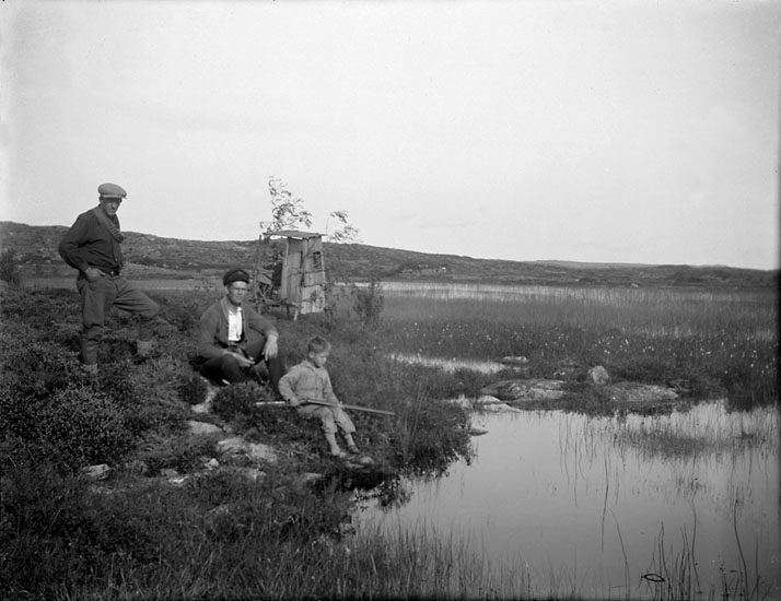 Enligt senare noteringar: "Andjakt vid dammen ovanför vägen till Slävik på Härnäset. Stående är Johan själv och sittande hans svåger, Erik Blank. Pojken okänd. Även detta fotografi taget med självutlösare".