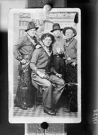 Enligt senare noteringar: "Avfotografering av äldre foto: skådespelargrupp utklädda till cow-boys."