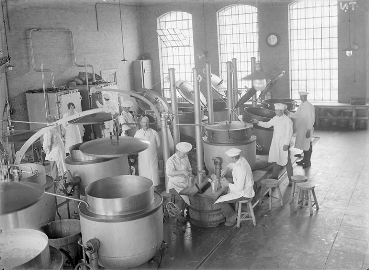 Enligt senare noteringar: "Köket i Bohusläns regemente, matsalsbyggnad. Interiör, kökspersonal."