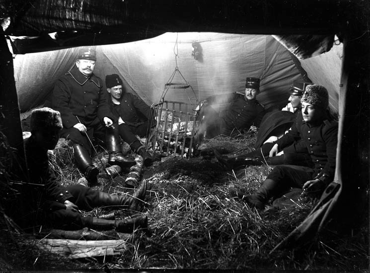 Enligt tidigare noteringar: "Militärer kring eldkorg i ett tält."