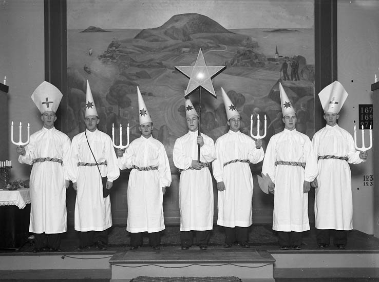 Text till bilden:"Stjärngossar framför tavlan i samlingssalenl".