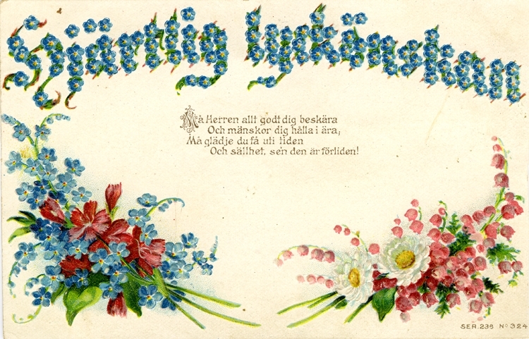Notering på kortet: Hjärtlig Lyckönskan. Må Herren allt godt dig beskära.