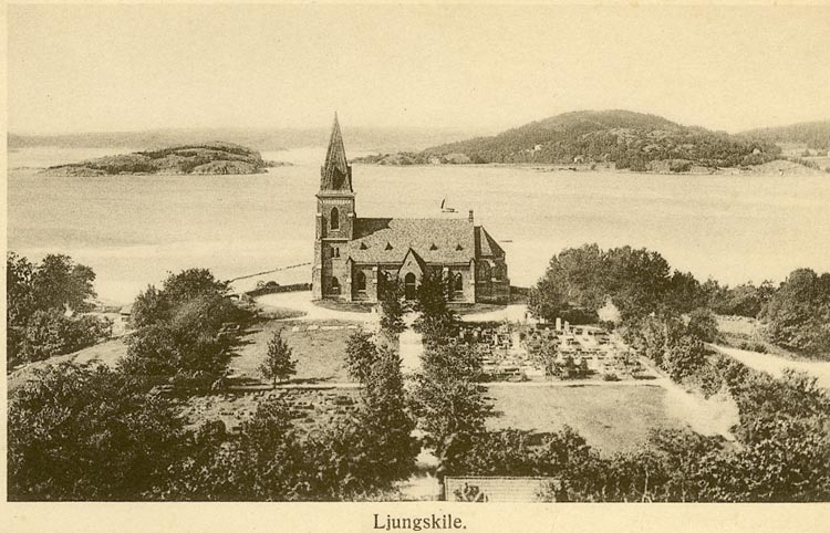 Enligt Bengt Lundins noteringar: "Ljungs kyrkan med segelbåt i bakgrunden".
