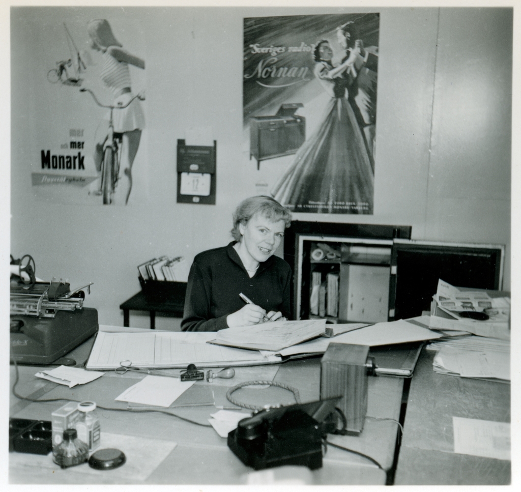 Kontoret på Monarks cykelverkstad. En kvinna sitter vid ett skrivbord och skriver i en pärm. På väggen bakom henne sitter en affisch med reklam för Monarks cyklar och en för Monarks radiomöbel "Sveriges radio Nornan".